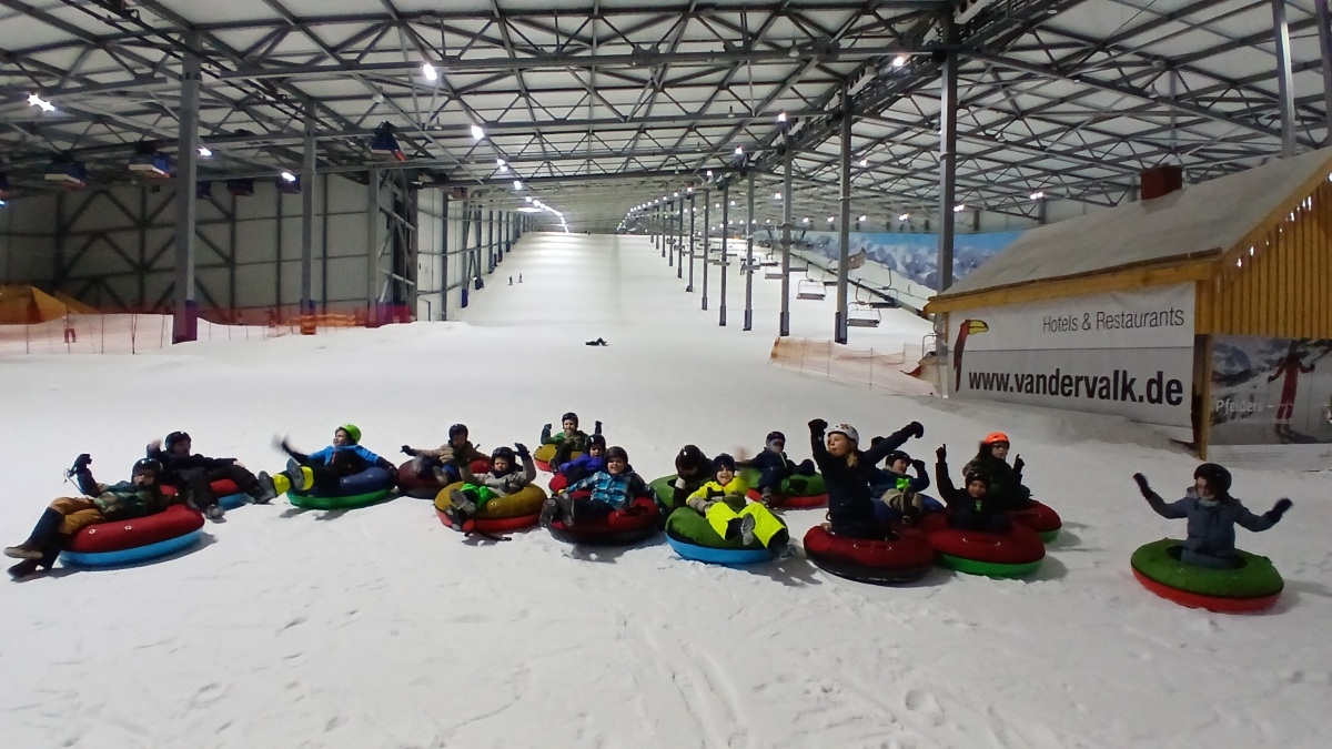 Nachdem alle Kinder mit Skihose, -jacke und Helm ausgestattet waren, gab es kein Halten mehr. Schnell schnappten sie sich noch einen großen Schlauchreifen und schon ging es die riesige Rutsche hinunter.